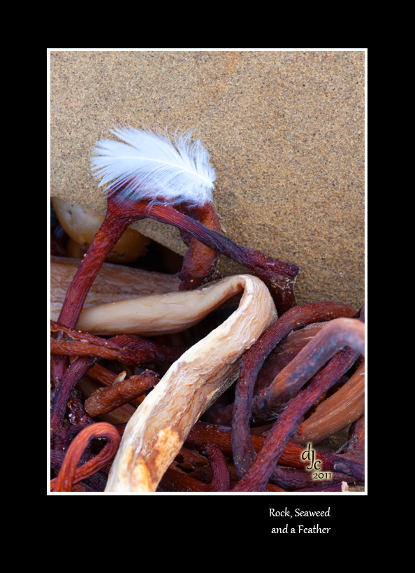 I didn't set up this shot. The feather was just there. I like the contrast of the jumble of colorful seaweed against the neutral grain of the rock, with the feather being the icing on the cake.